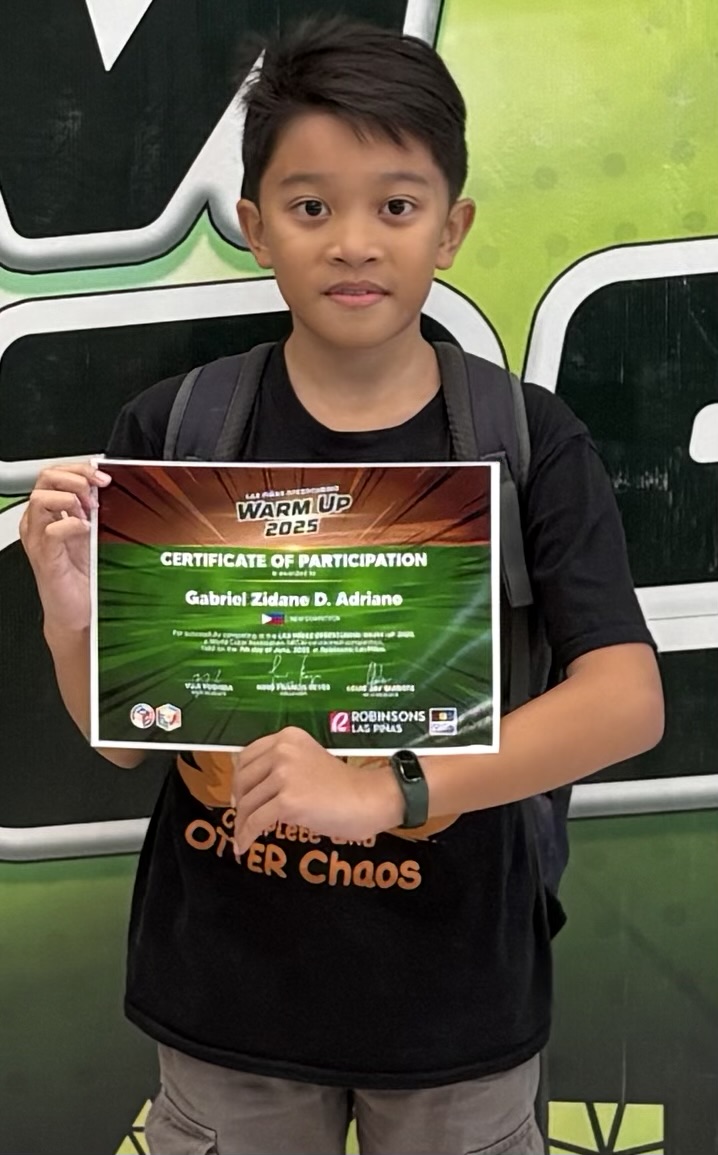 | Region | WCA ID | Gender | Competitions | Completed Solves | Philippines | 2025ADRI02 | Male | 2 | 38 |